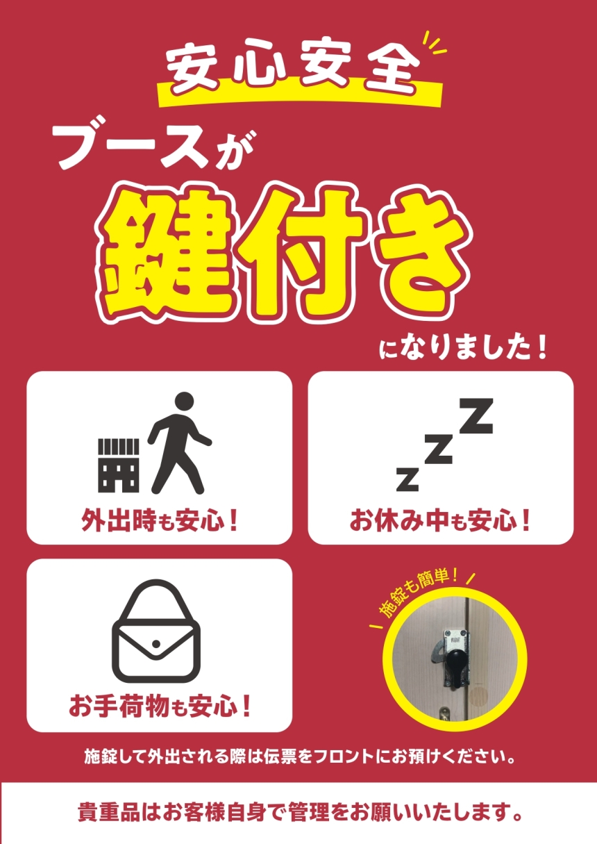 お客様の声をカタチに!安心・安全に当店をご利用頂く為にブース席フラットタイプの扉に鍵を設置致しました!