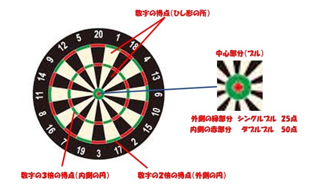 1~20の数字が円状に並べられており、その数字のひし形の範囲に入れば得点できます