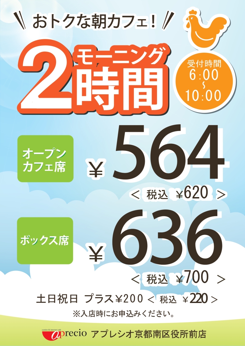 朝限定のお得なパックのご紹介!6:00~10:00受付、朝時間の限定2時間パックやってます!※会員様限定受付です※自動移行料金の対象外のパックです。ご入店時にお選び下さい。※利用後のパック取消、変更はできません。※休日は+200円料金が追加されます。