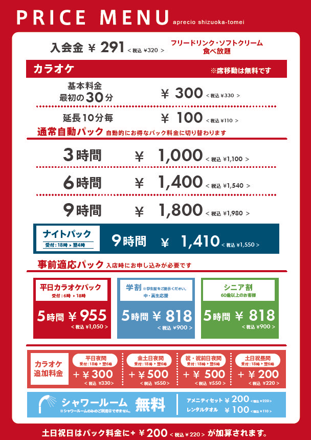お得に使える!アプレシオ静岡東名店のカラオケ料金表