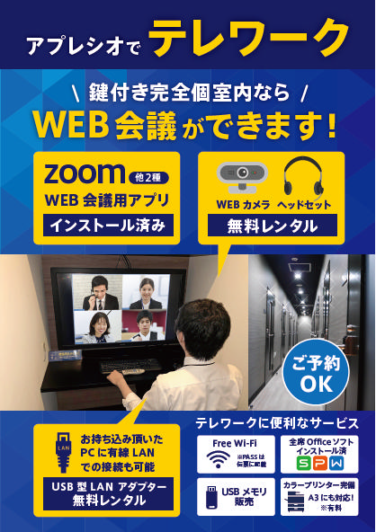 アプレシオ東静岡駅前店では安心で快適な鍵付き完全個室をご用意しております。防音だからテレワーク利用に最適です!WEBカメラとヘッドセットのレンタルもご用意しております。手ぶらでテレワーク利用可能なんです♪