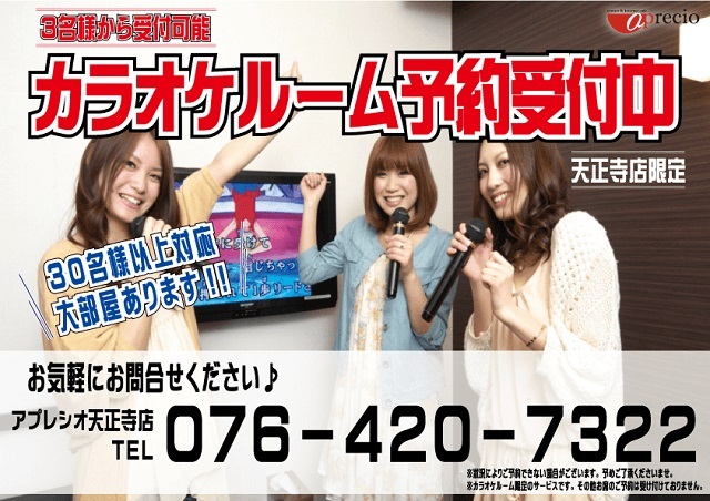 カラオケルーム予約受付中♪2次会、忘新年会、歓送迎会等大歓迎♬お気軽にお問い合わせください。(アプレシオ天正寺店)TEL:076-420-7322※カラオケルーム限定で3名様からご予約承ります。※状況によりご予約できない場合があります。予めご了承ください。※アプレシオ天正寺店限定のサービスです。