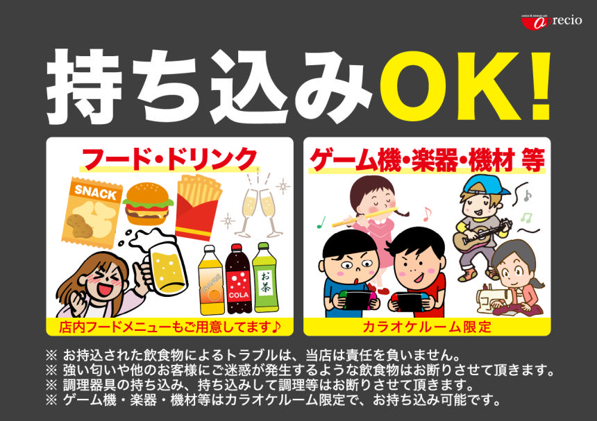 店内フードメニューもご用意しております。是非ご利用ください♪※ お持込された飲食物によるトラブルは、当店は責任を負いません。※ 強い匂いや他のお客様にご迷惑が発生するような飲食物はお断りさせて頂きます。※ 調理器具の持ち込み、持ち込みして調理等はお断りさせて頂きます。※ ゲーム機・楽器・機材等はカラオケルーム限定で、お持ち込み可能です。